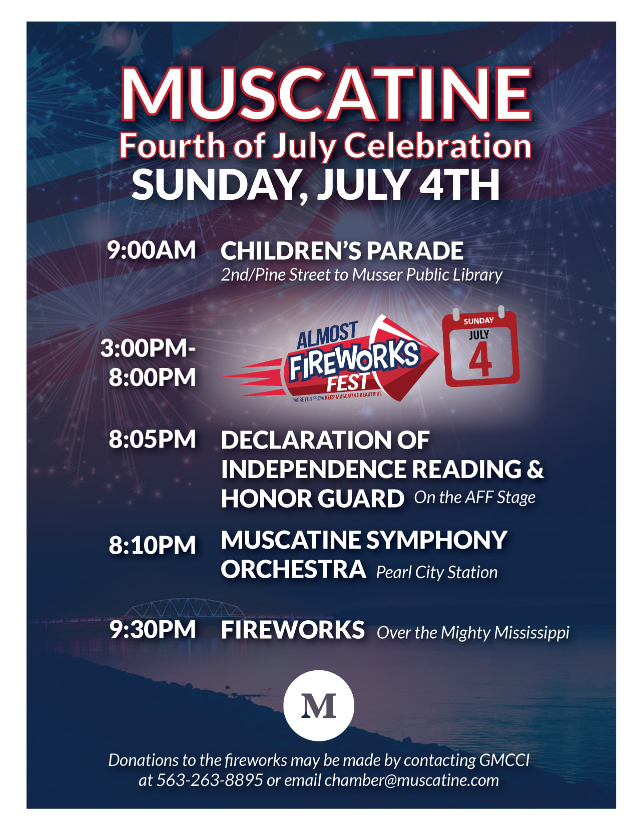 Check out the Muscatine 4th of July event schedule! The newly added Almost Fireworks Fest (Keep Muscatine Beautiful) will feature family-friendly activities such as bounce houses, face-painting and more! Enjoy live music and food trucks leading up to the reading of the Declaration of Independence, Muscatine Symphony Orchestra, and fireworks.