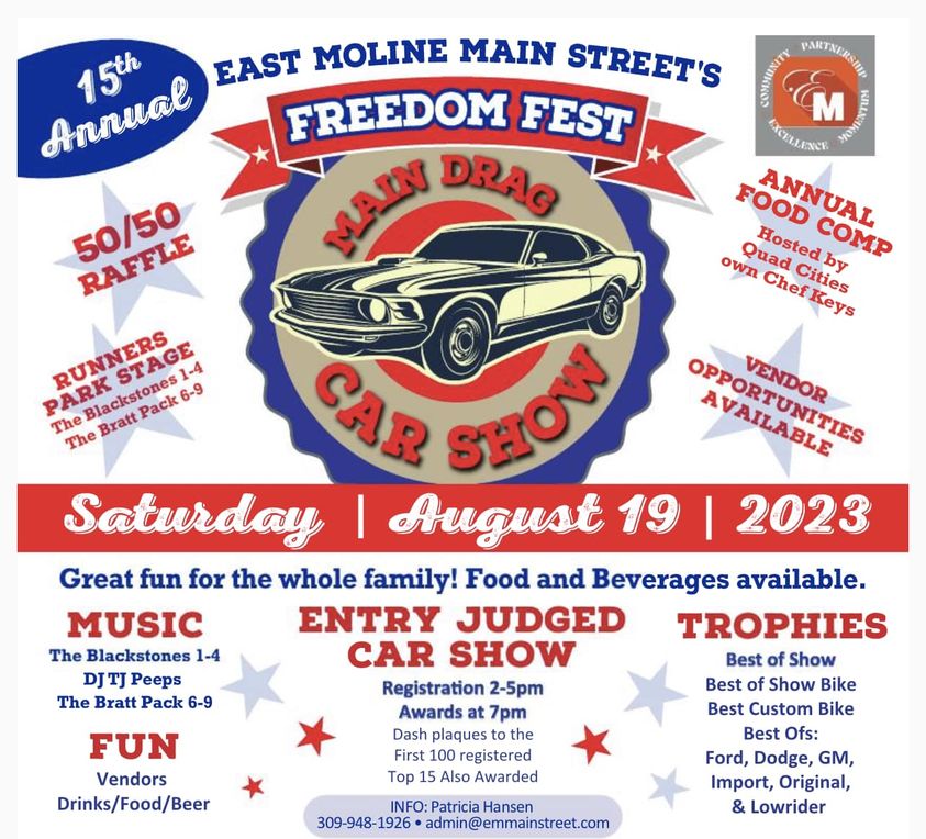 Join Downtown East Moline August 19th for Freedom Fest. 200+ Car & Bike Show