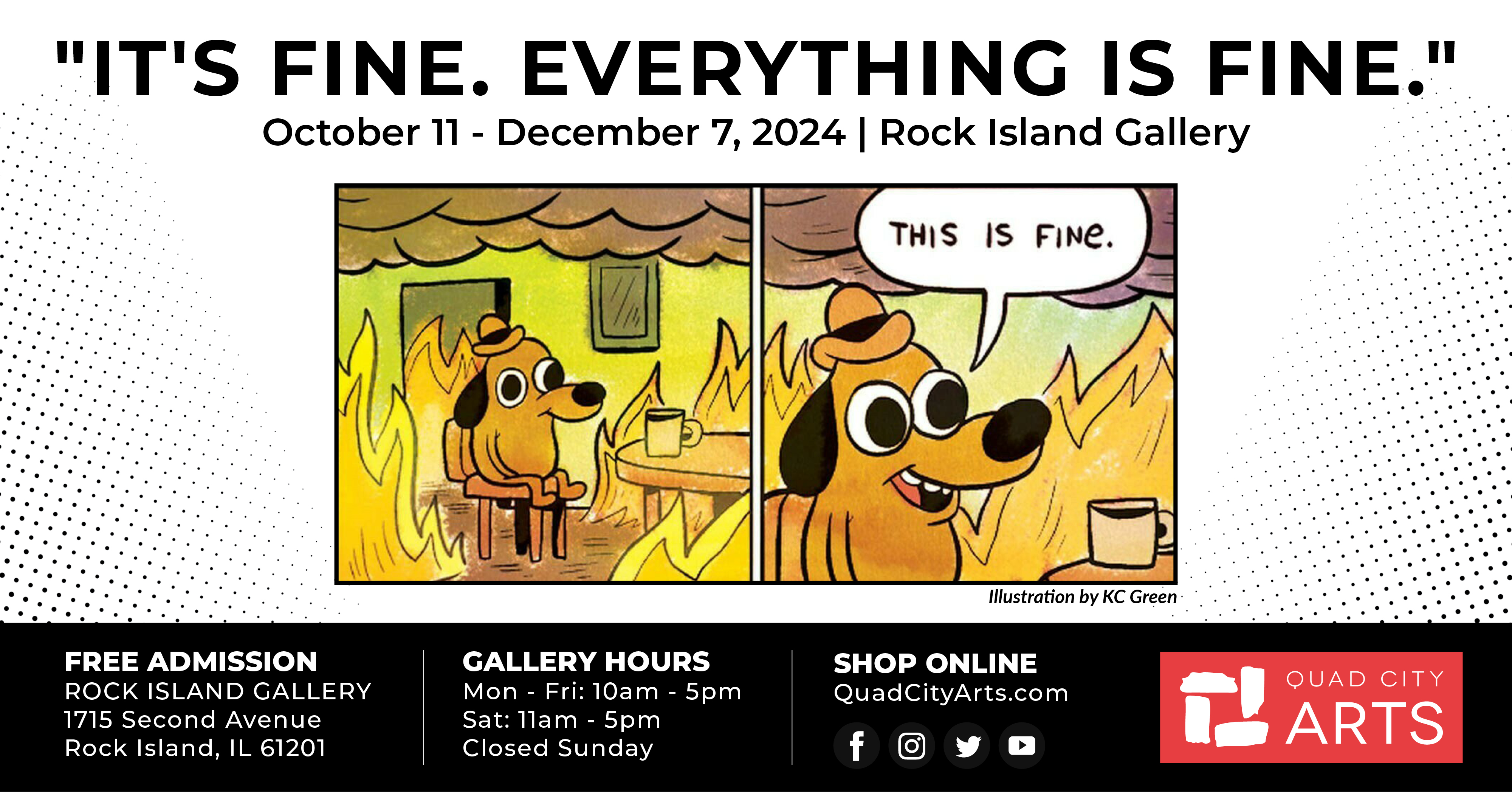 From October 11 - December 7, Quad City Arts presents a group show themed after the phrase, "It’s Fine. Everything is Fine." The public is invited to attend a FREE opening reception on October 12 from 5-8 pm, where the artists will be present, and refreshments will be served.
