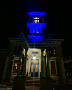 The 1877 mansion lit dramatically at night.