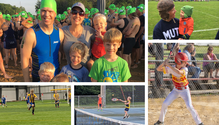 Photo: QC triathlon at West Lake, Scott County Park, IA, Vintage Football game at Douglas Park in Rock Island, IL, soccer at TBK Bank Sports Complex in Bettendorf, IA, Tennis Camp with Rock Island Fitness & Activity Center at Hodge Park, Rock Island, IL, and Up to bat with Jr Rocks travel baseball.